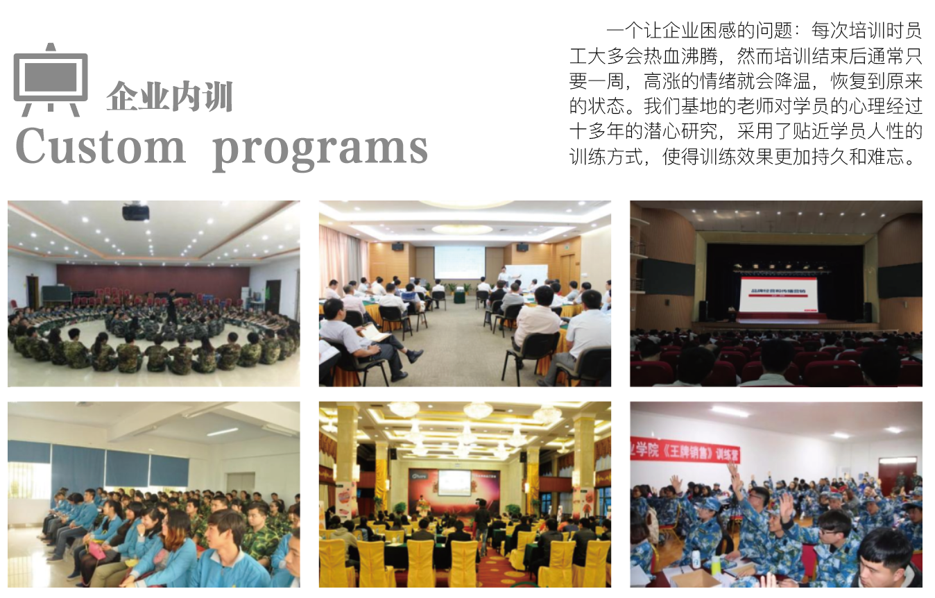 10多年軍事化訓(xùn)練、企業(yè)拓展訓(xùn)練經(jīng)驗(yàn)為您的團(tuán)隊(duì)提供溝通、執(zhí)行、凝聚力、團(tuán)隊(duì)突破等全方位培訓(xùn)方案!咨詢熱線:13027436788